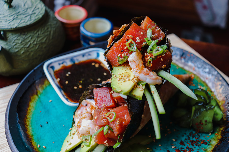 This unique handheld item is inspired by traditional sushi hand rolls and poke bowls.