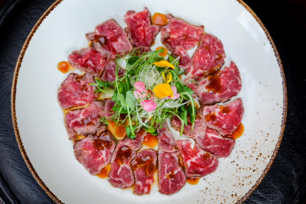 Carpaccio de carne e batata doce banhada em Glaze de Maracujá