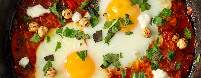 Popular across North Africa and the Middle East, this hearty breakfast dish is as eye-catching as it is delicious. It consists of eggs gently poached in a rustic, spicy tomato and bell pepper sauce. Top with fried chickpeas, feta, red onion and cilantro and serve with grilled pita bread.