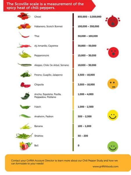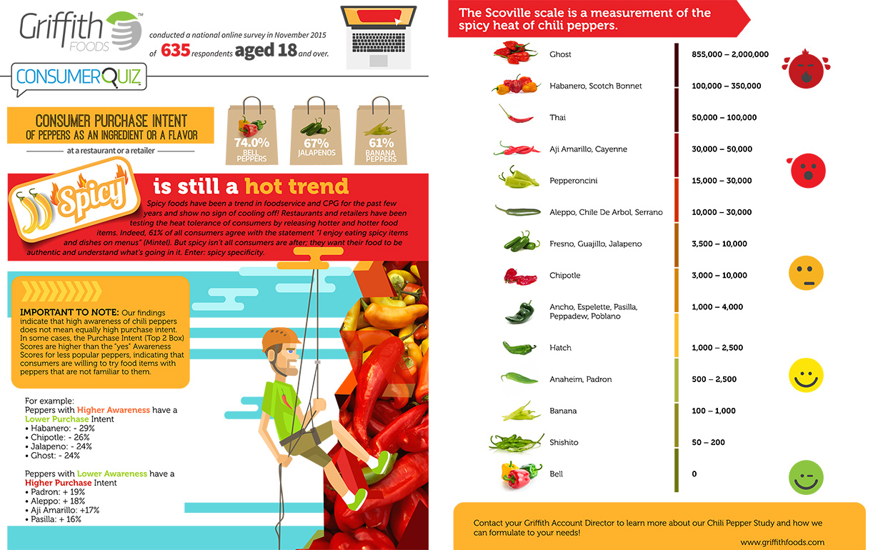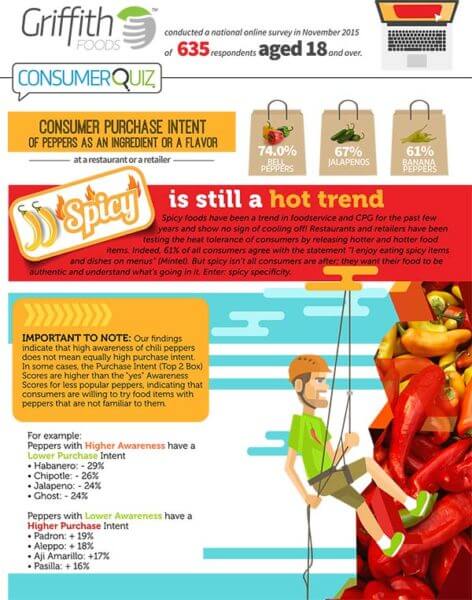 Spicy food and calling out specific pepper heat sources is a hot trend in the food world right now, pun intended. This past November, the Griffith Foods Consumer Insights Team decided to dive into the world of peppers and explore people’s preferences by creating a national, online survey. The 635 respondents, all 18 or older, answered questions regarding awareness and purchase intent of 25 peppers, as well as their preferred heat level in food. Our favorite finding from this study – consumers are interested in purchasing lesser known peppers that they are not necessarily aware of! In terms of flavor innovation in products and dishes, this means that consumers are adventurous and interested in expanding their spicy horizons. See below for a fun info-graphic summarizing our findings.