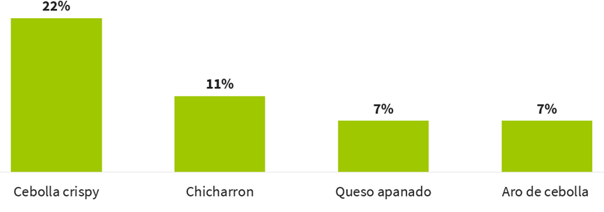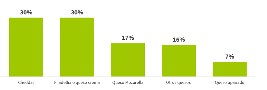 • El 16% llamado otros quesos lo identificamos como una combinación de dos quesos o eran algunos como el americano, la burrata, stracciatella y etc. Las fusiones de sabor, incluso en quesos, siguen llamando la atención del consumidor.