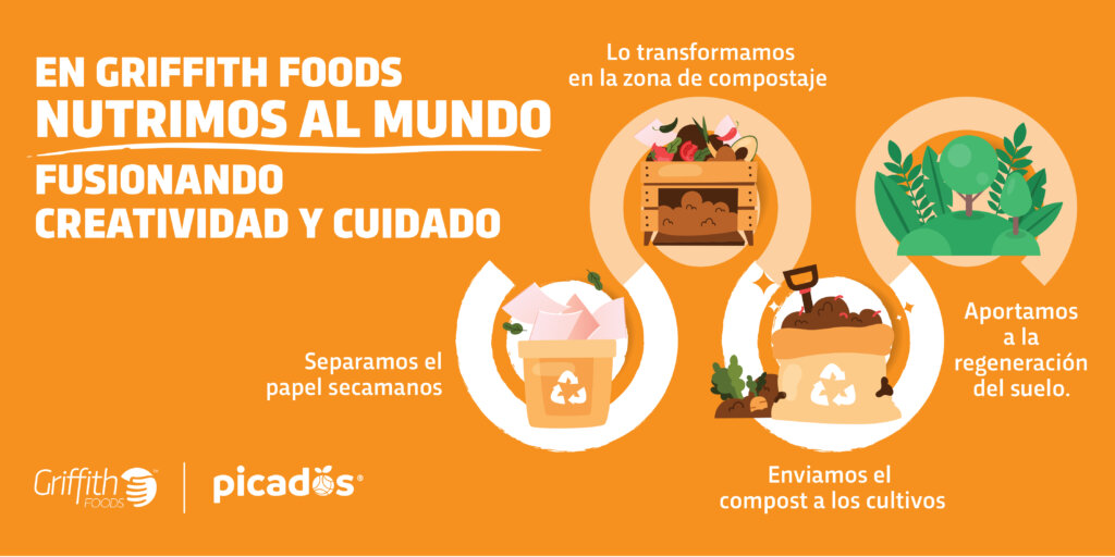 Nuestro trabajo conjunto con Picados® ha dado lugar a una iniciativa inspiradora: la transformación del papel secamanos que usamos en Griffith Foods y Picados® en compost de alta calidad, este ciclo completo devuelve los nutrientes al suelo y contribuye a la mejora de la salud del mismo.