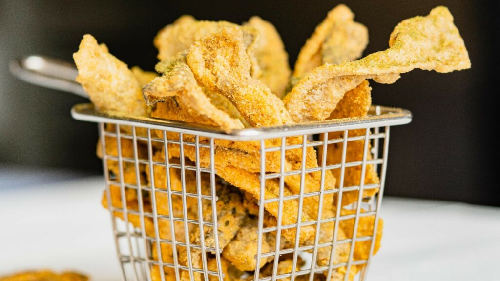 Ingredientes de subprodutos reciclados e partes subutilizadas dão a este petisco indulgente uma vantagem única. A pele limpa e seca do salmão se torna um purê com banana verde em pó e frita até inchar. O snack perfeitamente crocante é polvilhado com pimenta verde e molho de tomatillo verde e guarnecido com rodelas de limão.