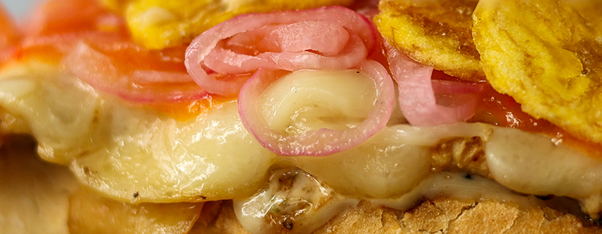 This bold and flavorful sandwich pulls inspiration from the classic Cubano but takes it in a brand-new direction. Marinate chicken in a zesty mojo sauce, grill, and serve on crusty French bread with jalapeño mayonnaise, Swiss cheese, crunchy beetroot chips and habanero orange sauce.