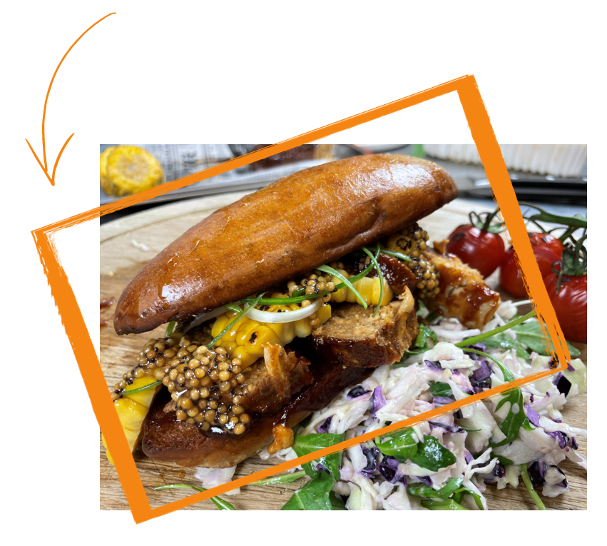 This appetizing sandwich has been created by our chefs to hero a Smokey Kentucky BBQ glazed rib, garnished with burned corn, mustard and poppy caviar, and served with coleslaw.