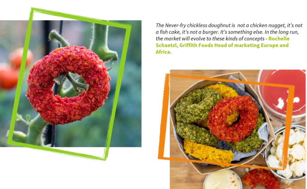 These colourful chickenless donuts are coated with our innovative never-fry vegetable based coating systems paired with seasonings: Pesto-Spinach, BBQ-Beetrot and Curry-Carrot. Eager to know more about this innovation? Reach out to us!