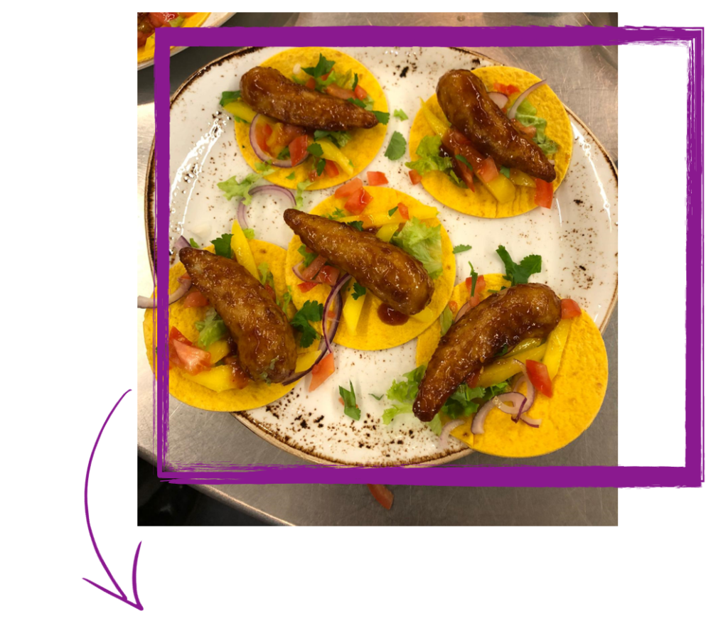 Why not try our vegan chicken tacos garnished with mango, lettuce, tomato and coriander. The substrate is glazed with a distinctly sweet Asian style marinade which combines beautifully with the sweet and spicy mango chutney.