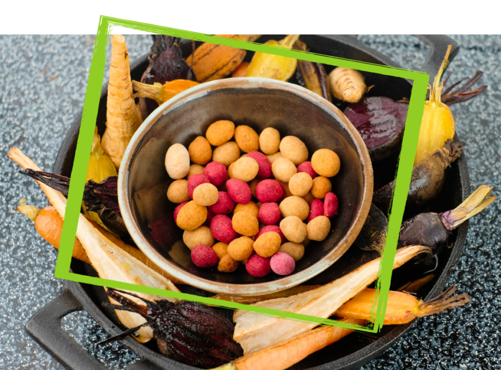 Our Veggie Coated Nuts are a unique combination of vegetables and nuts. Combining healthy fibres and fats, these tasty treats can be included as healthier snacks in a balanced diet. Oven baked or fried, our patented coating composition is derived from 20% dehydrated vegetable powder which delivers significant extra fibre and a signature crunch.