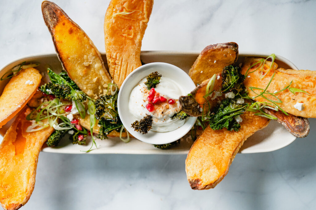 Sweet potato slices dredged in teff-based tempura batter inspired by injera, the signature spongy fermented flatbread of Ethiopian cuisine. Deep-fried until crisp and served with a smoky toasted salt and berbere spice dip.