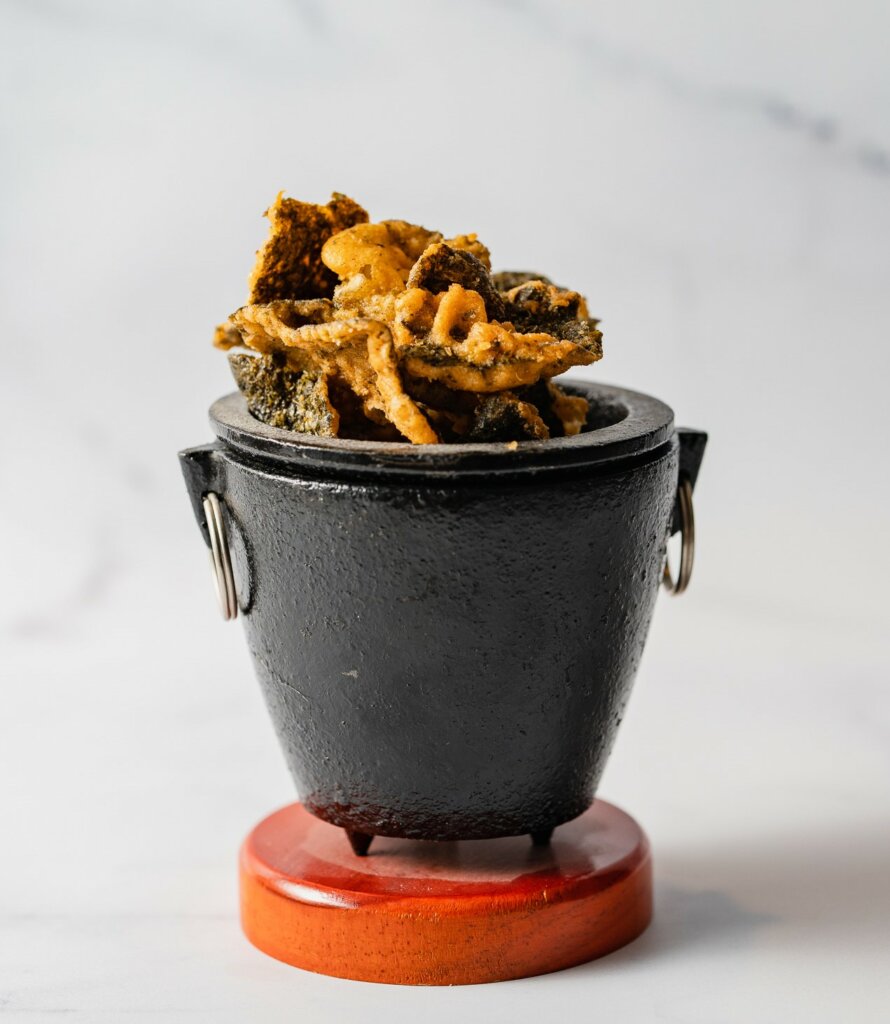 An extruded snack made from dried salmon skins puréed with green banana powder and water. Deep-fried until puffed and perfectly crispy, dusted with green chile and tomatillo salsa verde seasoning and a splash of lime for bright and bold flavor.
