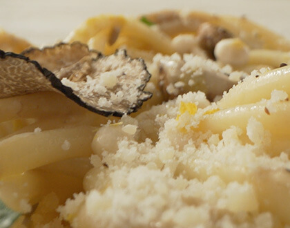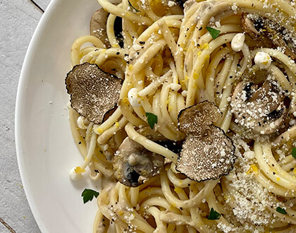 Al dente bucatini tossed with a creamy truffle sauce, topped with sautéed porcini mushrooms and aged Parmesan cheese. Finished with black truffle and parsley.