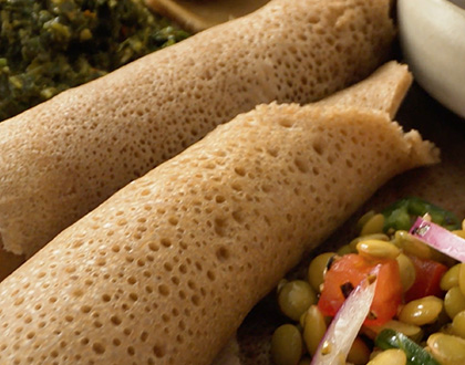 Injera is a fermented pancake-like flatbread traditionally made from teff flour. It’s a staple of Ethiopian and Eritrean cuisine, used both as a plate and as a utensil to scoop up stews and salads.