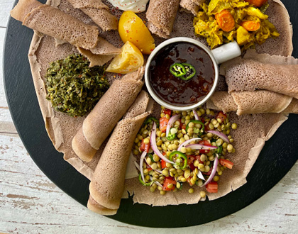 Spongy flatbread served with atkilt wot (sautéed cabbage, potatoes and carrots), azifa (lentil salad), chermoula (herb sauce), blatjang (apricot chutney) and labneh (yogurt).